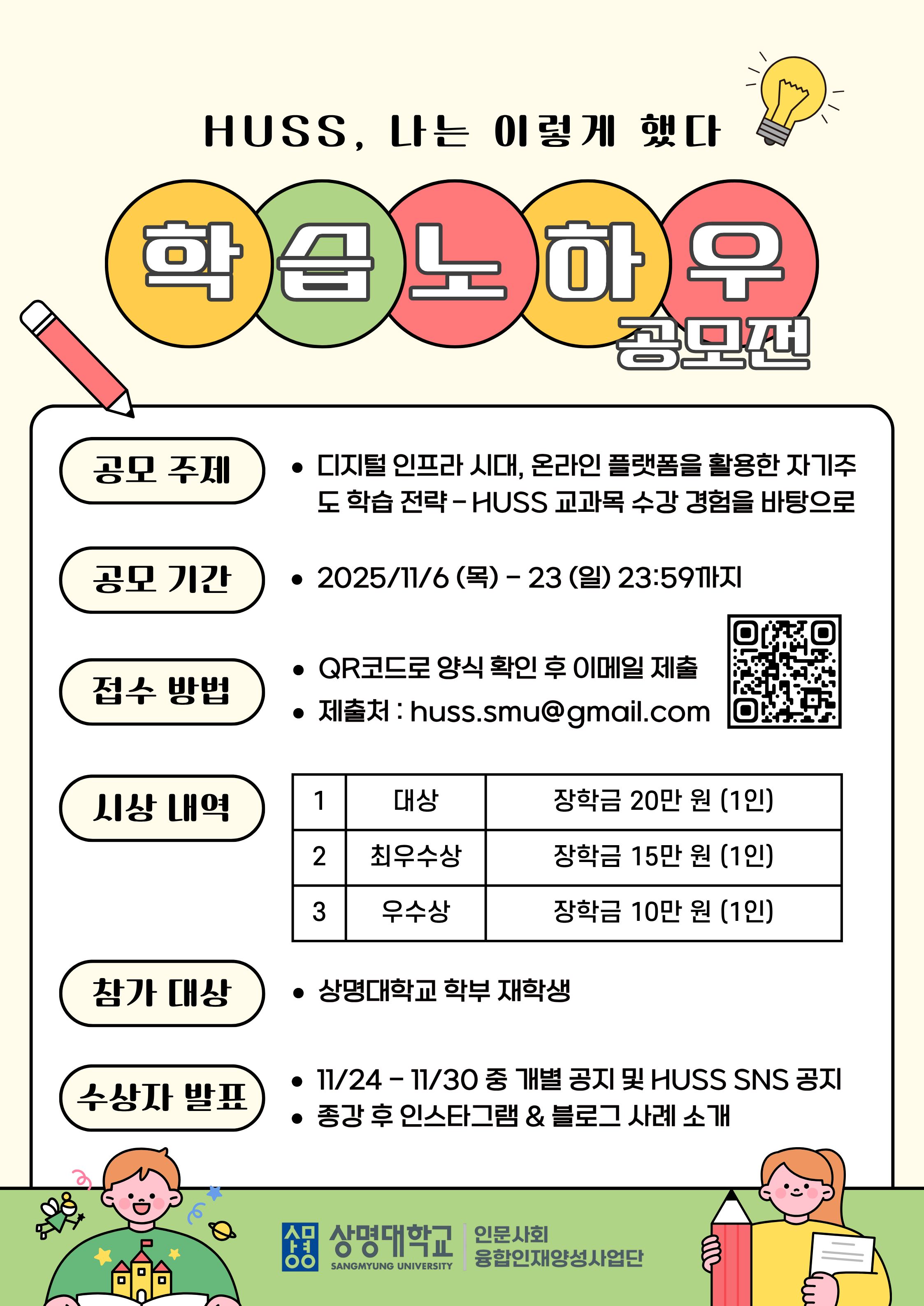 상명대학교 인문사회 융합인재양성사업단에서 ‘HUSS, 나는 이렇게 했다!: 나만의 학습 노하우 공모전’을 아래와 같이 개최합니다.